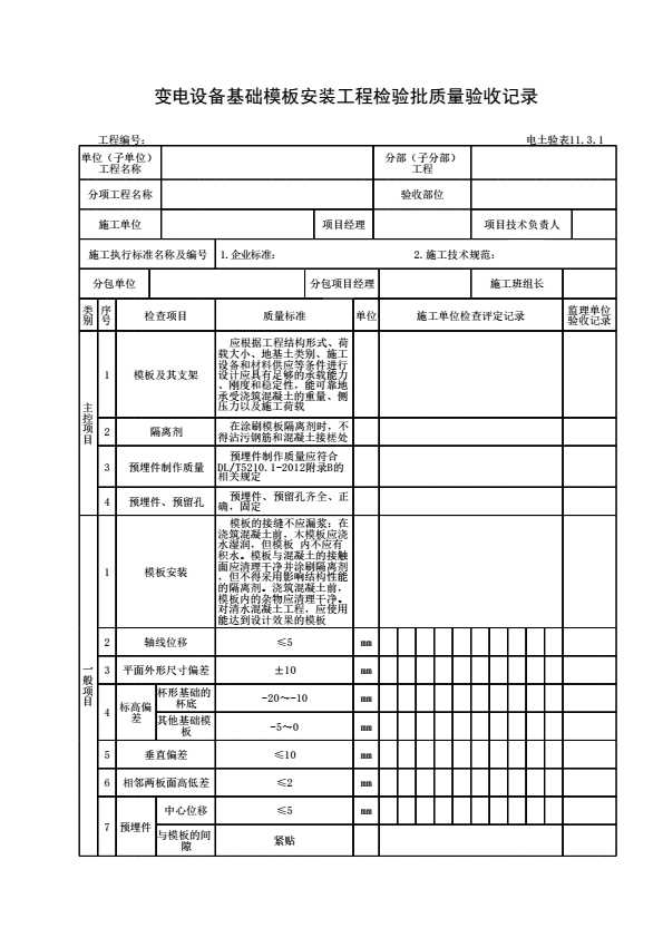 表格名称:电土验表11.3.1 变电设备基础模板安装工程检验批质量验收记录