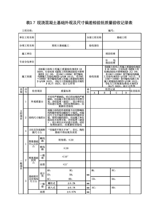 表格名称:表3.7 现浇混凝土基础外观及尺寸偏差检验批质量验收记录表