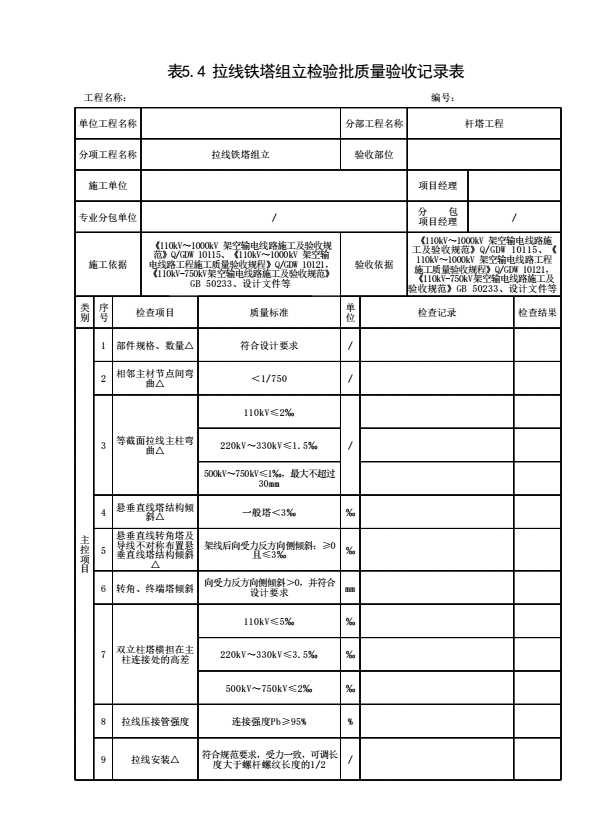 表格名称:表5.4 拉线铁塔组立检验批质量验收记录表
