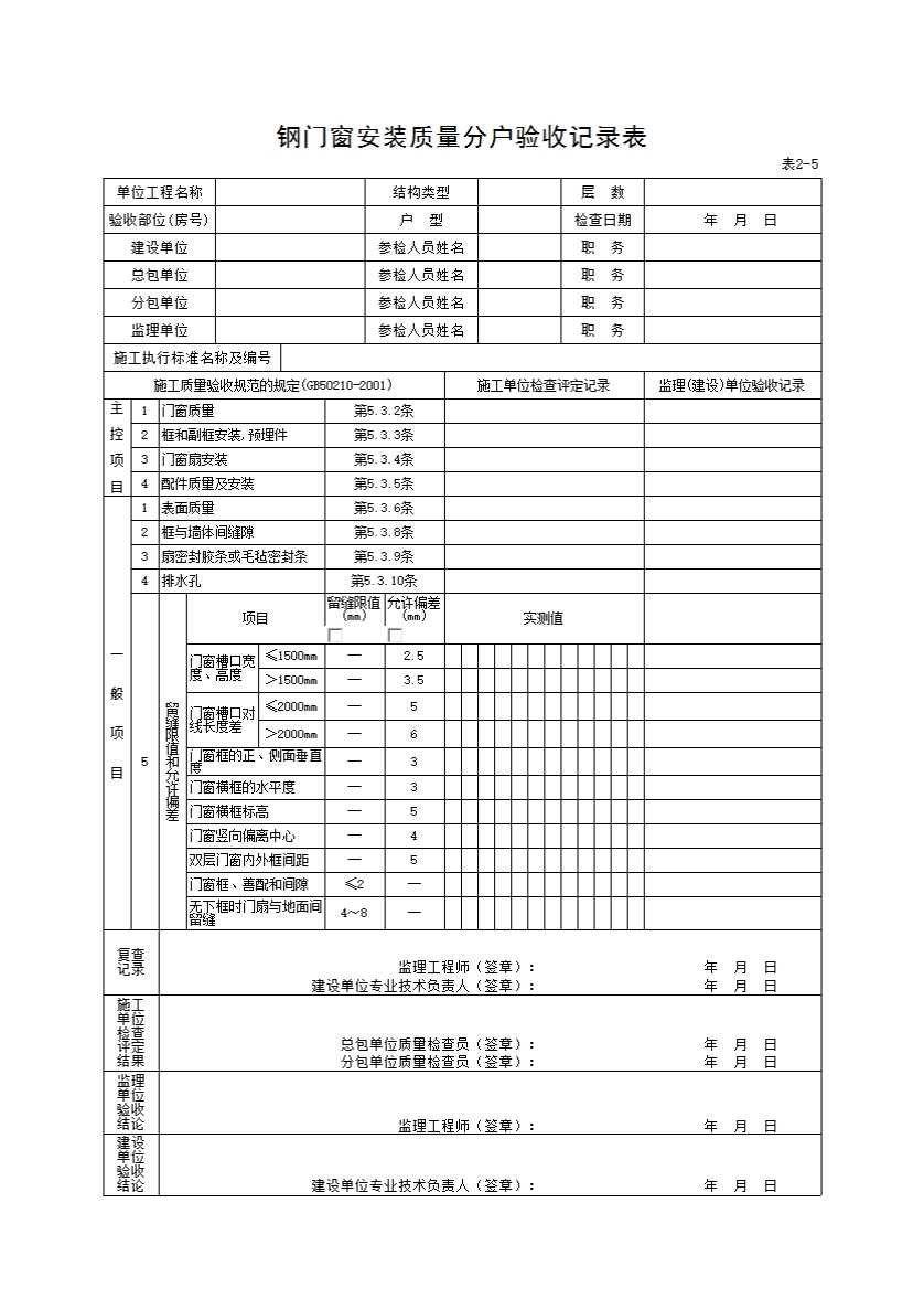 表格名称:2-5钢门窗安装质量分户验收记录表