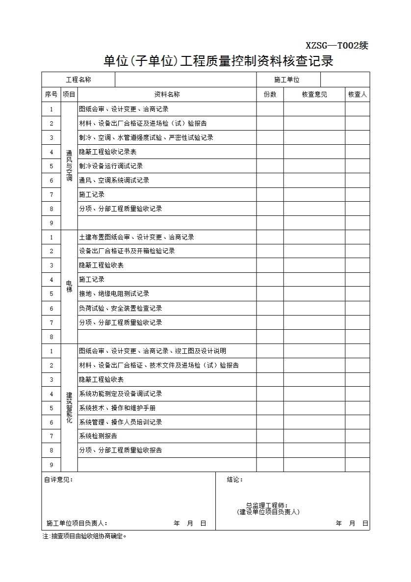 一、本表适用于单位(子单位)工程质量控制资料的核查记录。