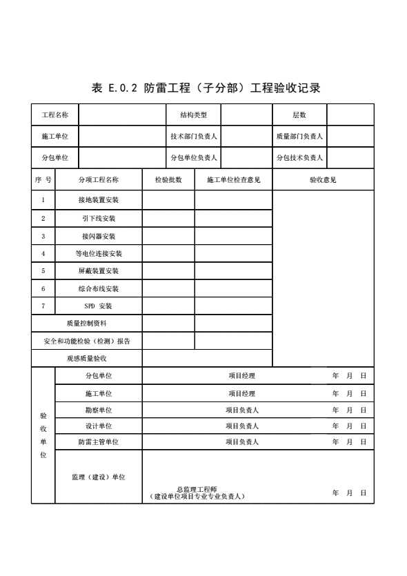 表格名称:表E.0.2 防雷工程(子分部)工程验收记录