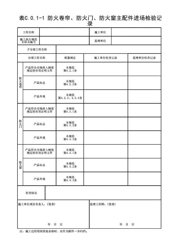 表格名称:表C.0.1-1 防火卷帘、防火门、防火窗主配件进场检验记录