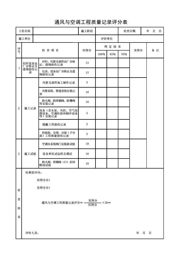 通风与空调工程质量记录评分表