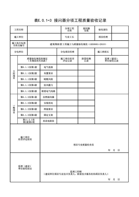 表格名称:表E.0.1-3 接闪器分项工程质量验收记录