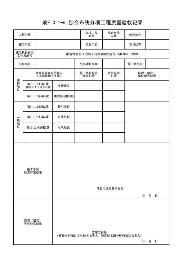 表格名称:表E.0.1-6 综合布线分项工程质量验收记录