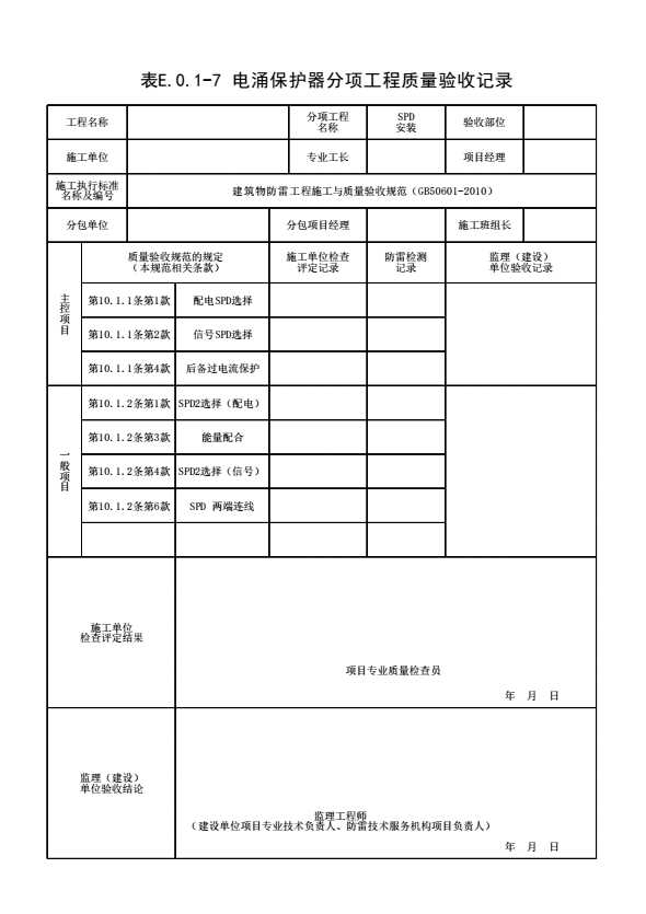 表格名称:表E.0.1-7 电涌保护器分项工程质量验收记录