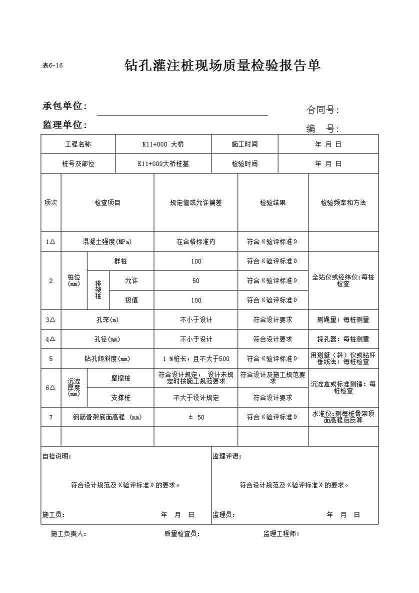 表格名称:表6-16 钻孔灌注桩现场质量检验报告单