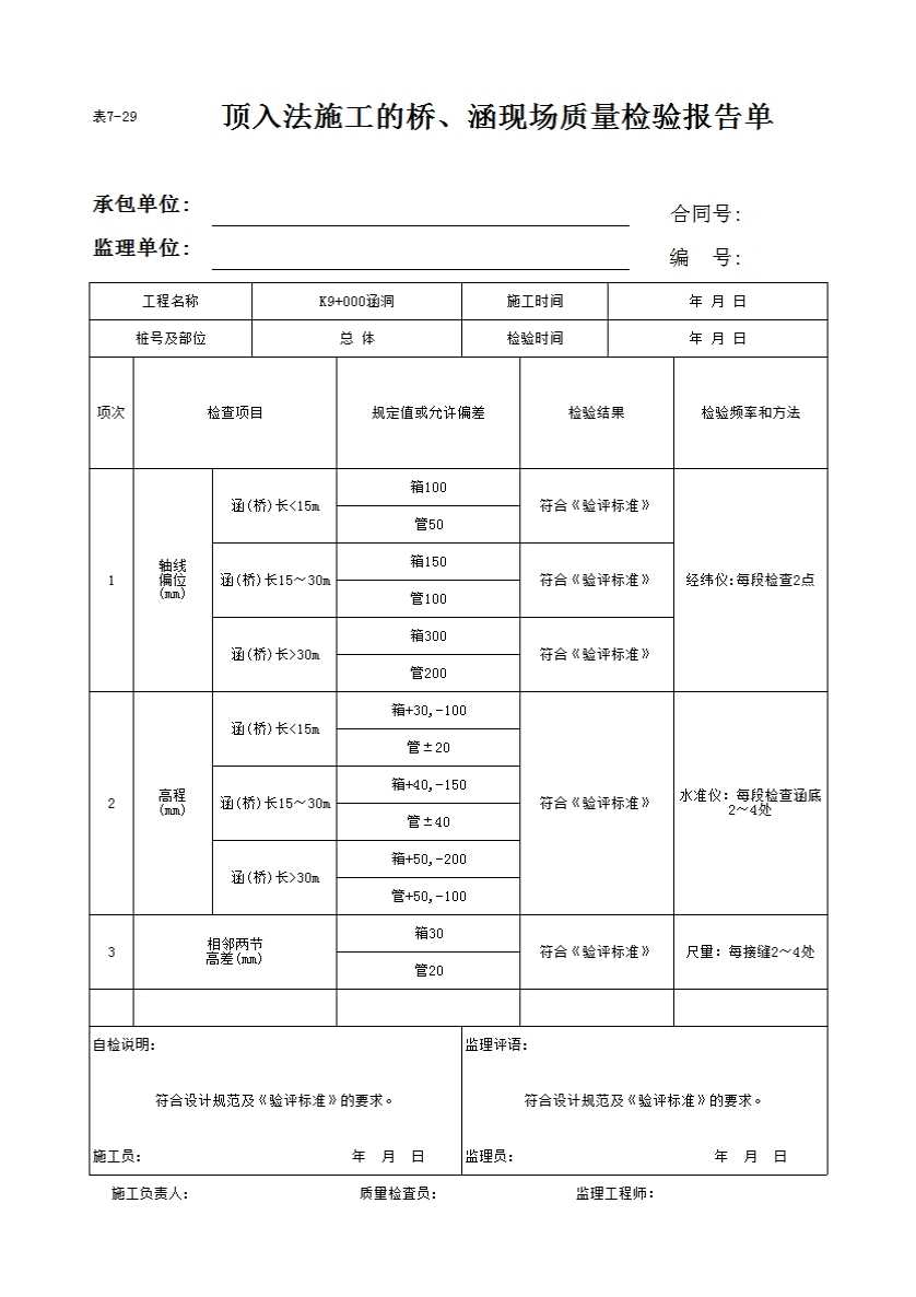 表格名称:表7-29 顶入法施工的桥、涵现场质量检验报告单