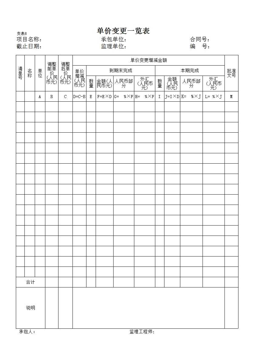 表格名称:支表8 单价变更一览表