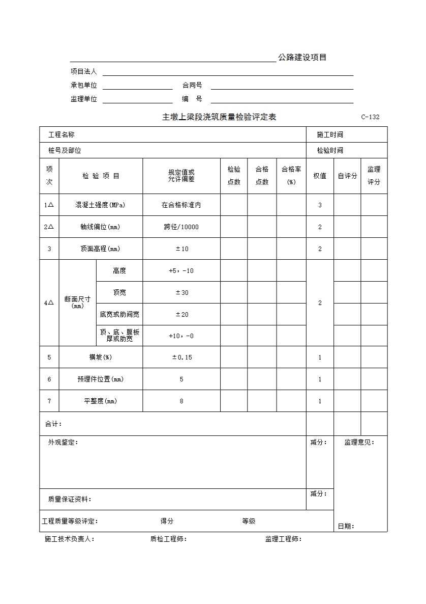 表格名称:C-132 主墩上梁段浇筑质量检验评定表