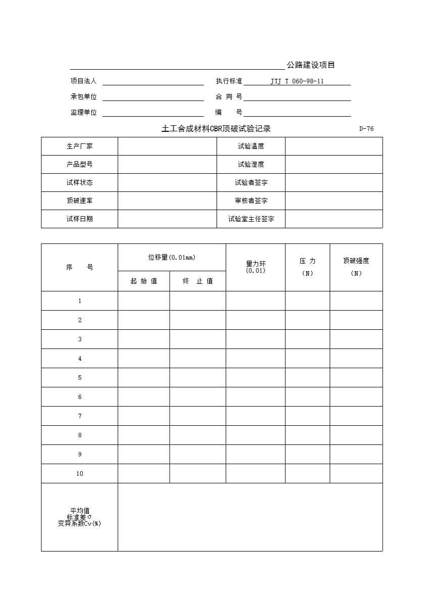 表格名称:D-76 土工合成材料CBR顶破试验记录