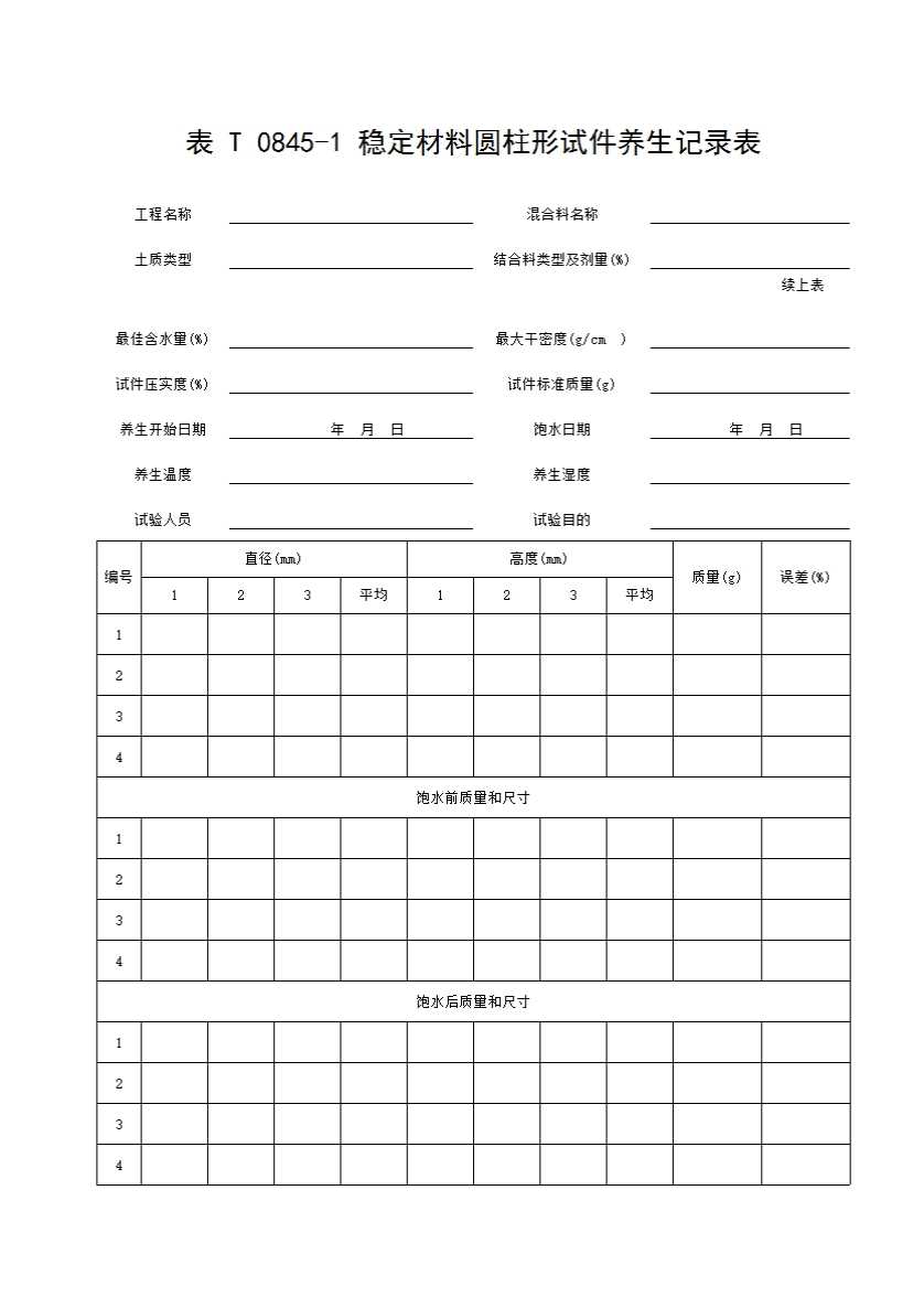 表 T 0845-1 稳定材料圆柱形试件养生记录表