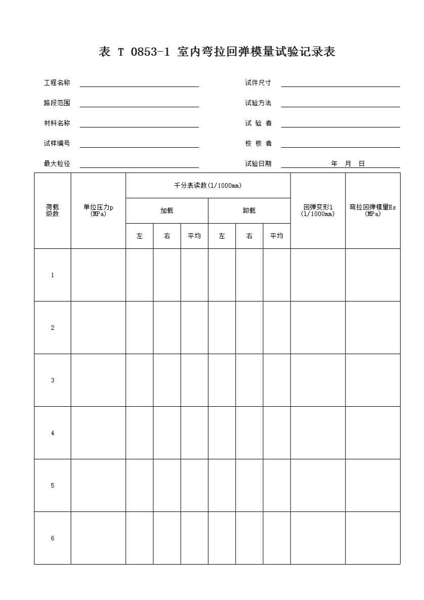 表格名称:表 T 0853-1 室内弯拉回弹模量试验记录表