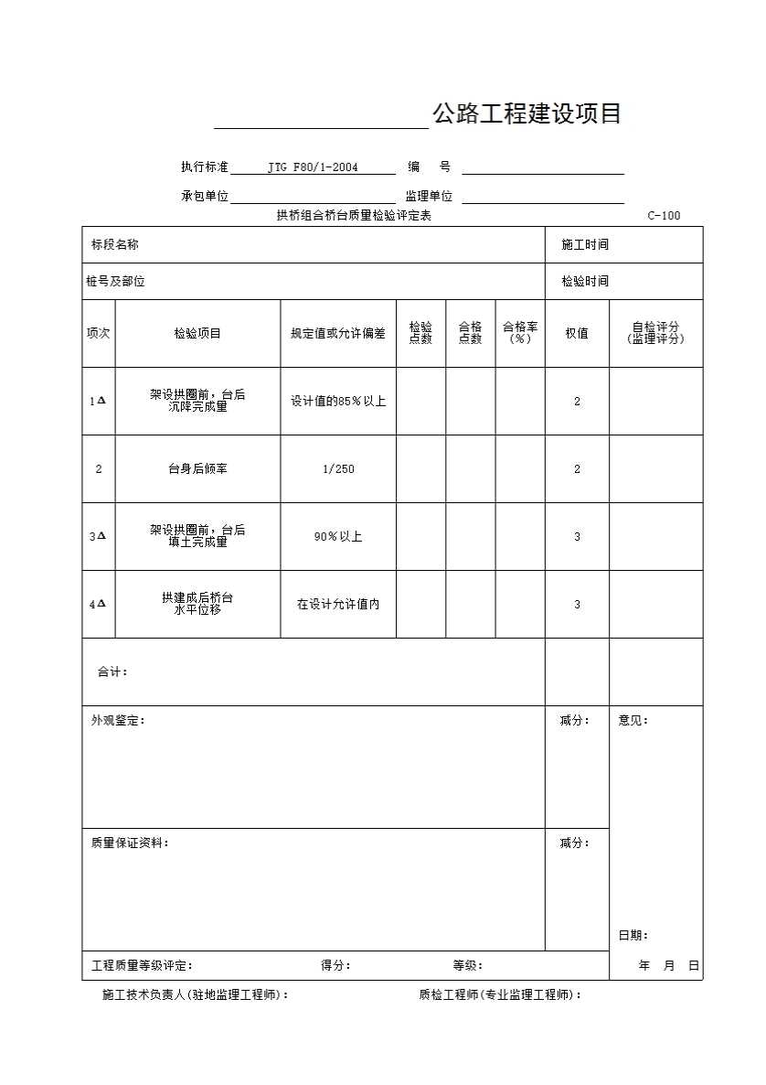 表格名称:C-100表 拱桥组合桥台质量检验评定表