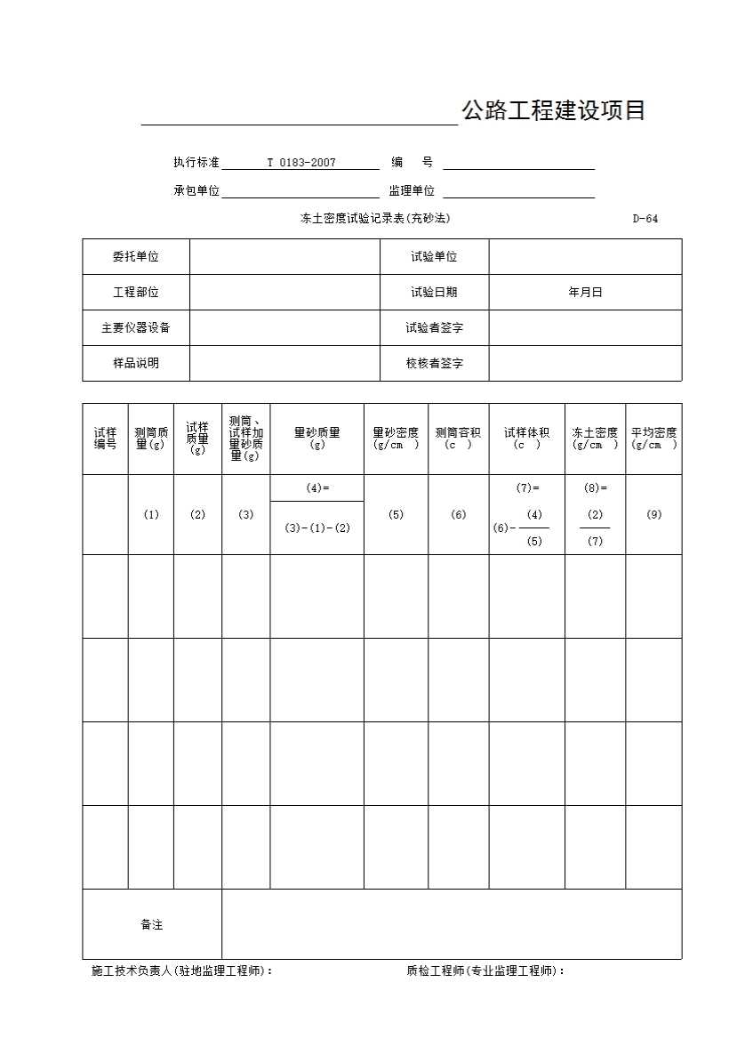 表格名称:D-64 冻土密度试验记录表(充砂法)