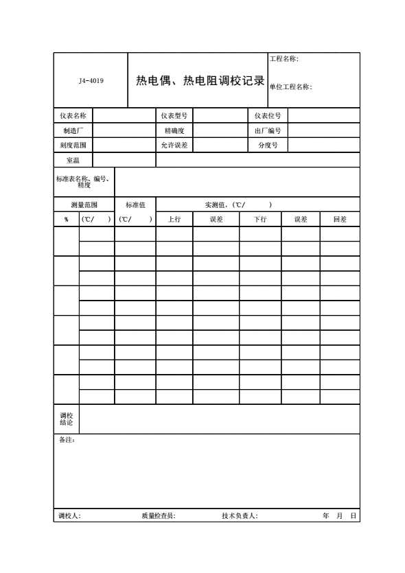 表格名称:J4-4019 热电偶、热电阻调校记录