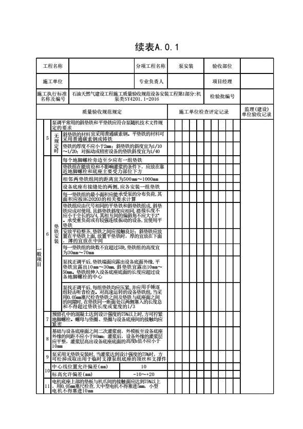 表格名称:表A.0.1 泵安装工程检验批质量验收记录
