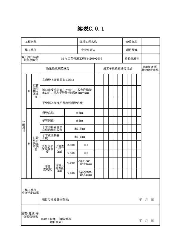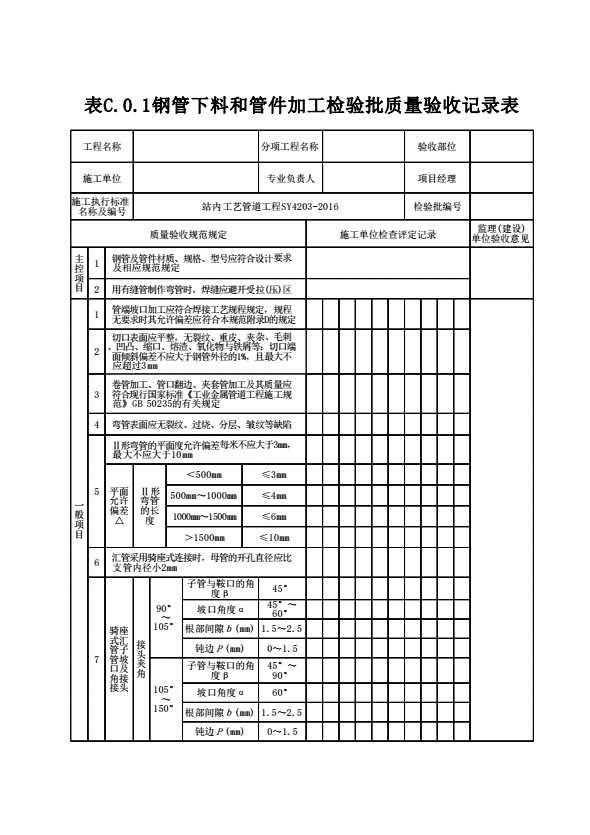 表格名称:表C.0.1 钢管下料和管件加工检验批质量验收记录表