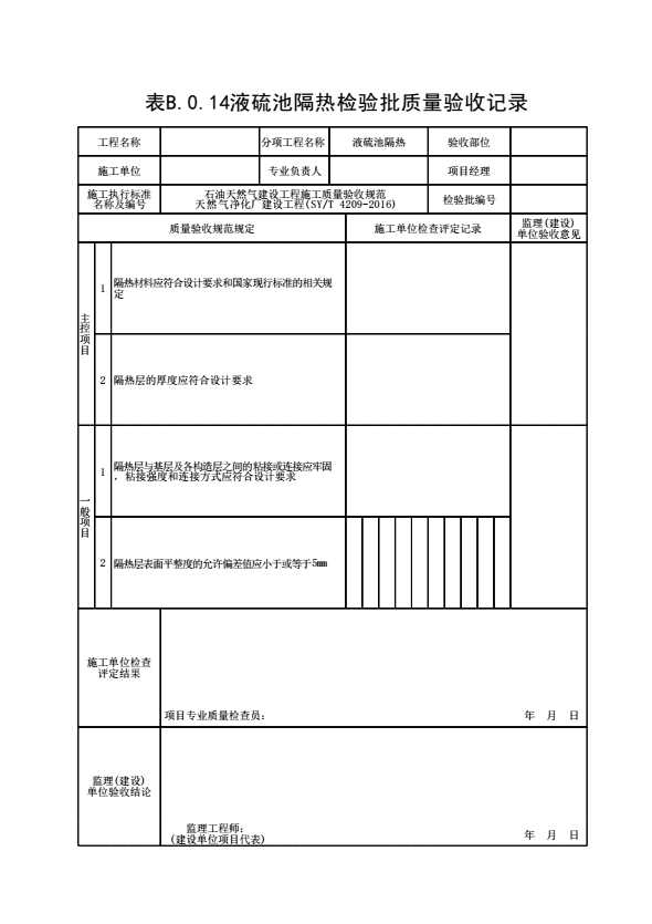 表格名称:表B.0.14 液硫池隔热检验批质量验收记录