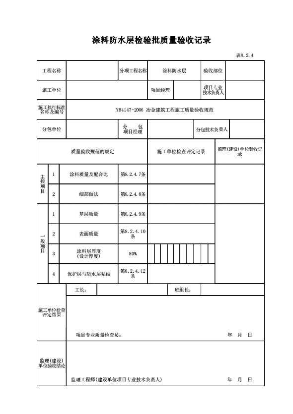 表格名称:表8.2.4 涂料防水层检验批质量验收记录