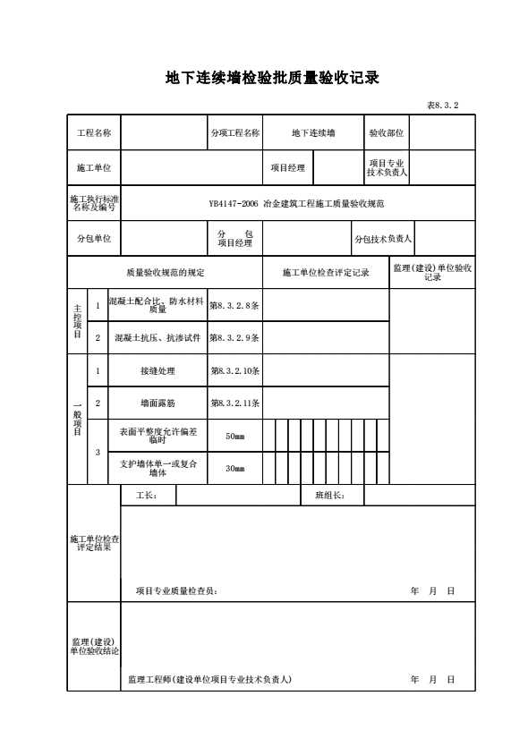 表格名称:表8.3.2 地下连续墙检验批质量验收记录