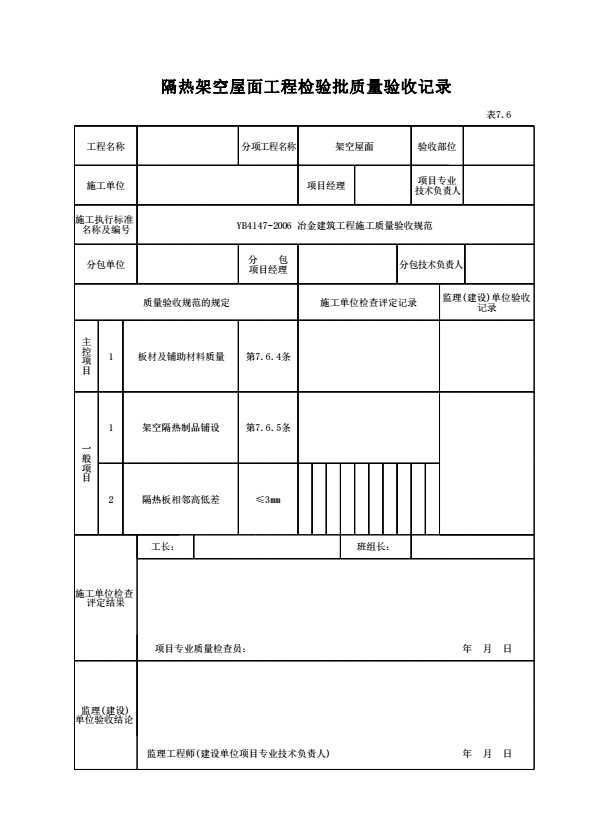 表格名称:表7.6 隔热架空屋面工程检验批质量验收记录