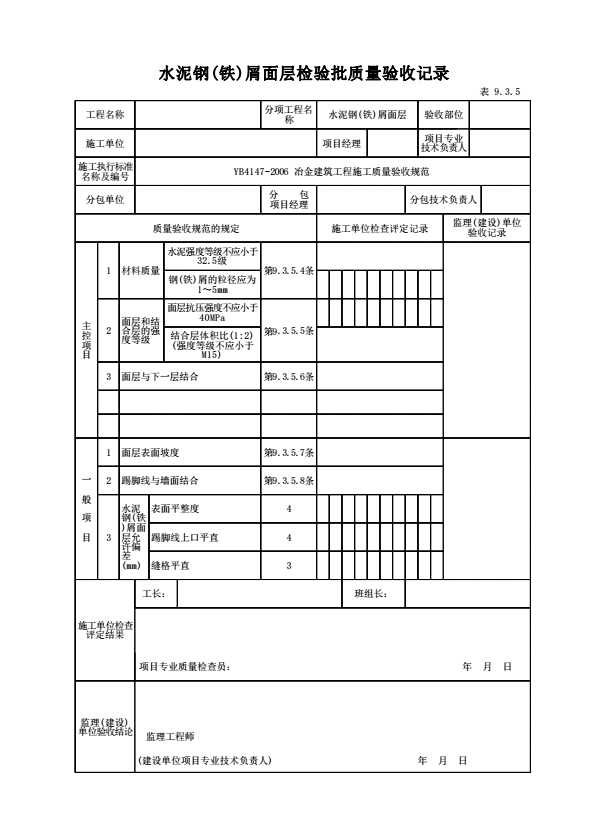 表格名称:表9.3.5 水泥钢(铁)屑面层检验批质量验收记录