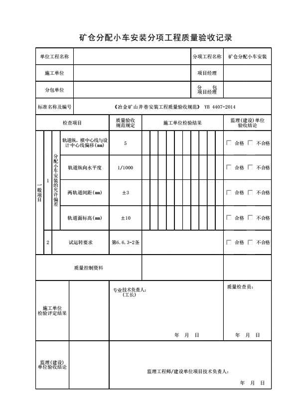 表格名称:矿仓分配小车安装分项工程质量验收记录
