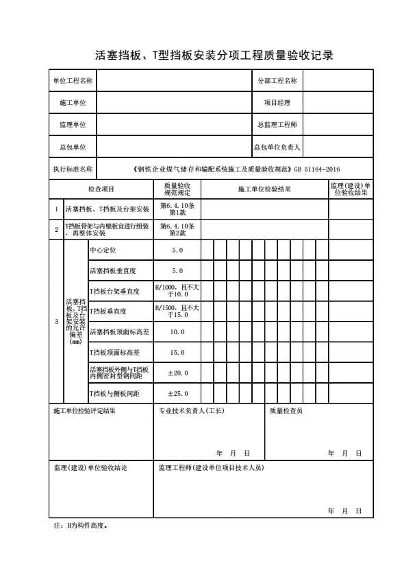 表格名称:活塞挡板、T型挡板安装分项工程质量验收记录