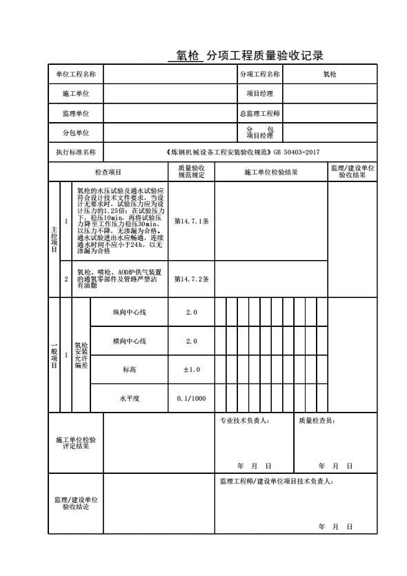 表格名称:氧枪分项工程质量验收记录