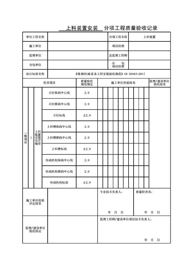 表格名称:上料装置安装分项工程质量验收记录