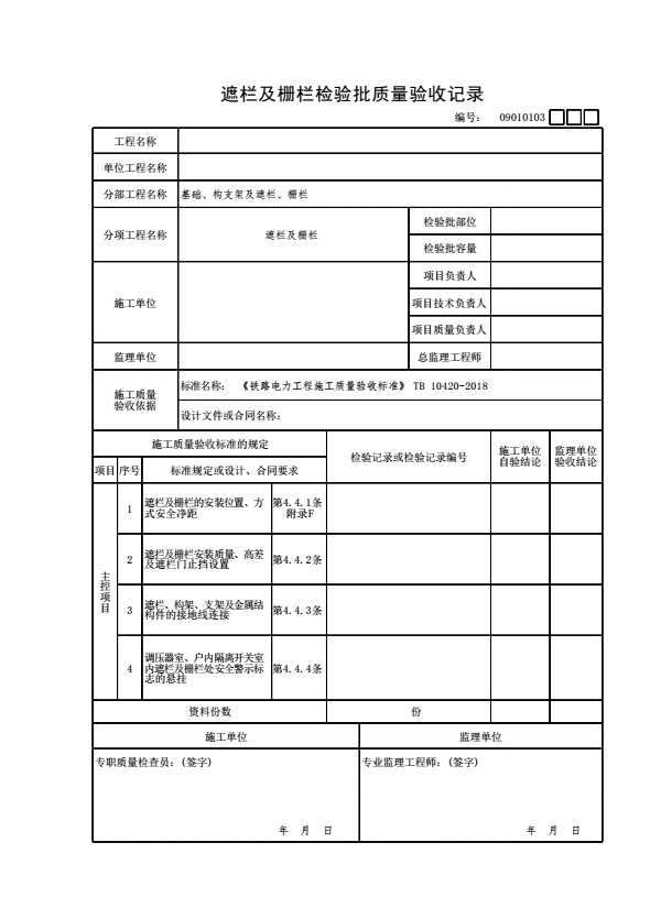表格名称:09010103 遮栏及栅栏检验批质量验收记录