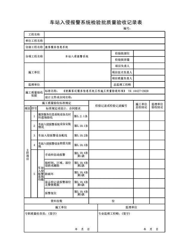 表格名称:车站入侵报警系统检验批质量验收记录表