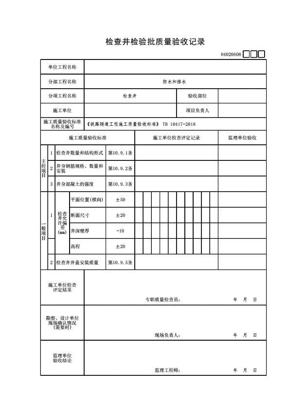 表格名称:04020608 检查井检验批质量验收记录