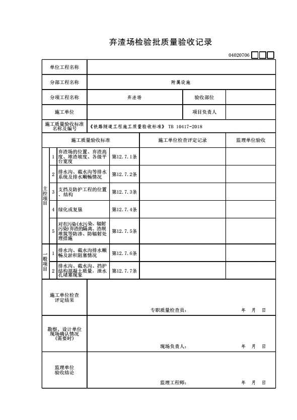 表格名称:04020706 弃渣场检验批质量验收记录