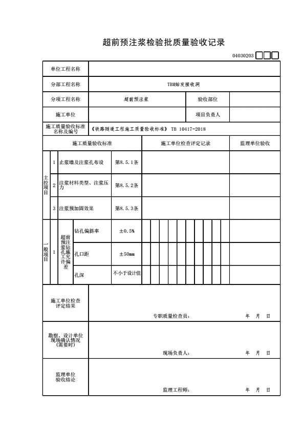 表格名称:04030203 超前预注浆检验批质量验收记录