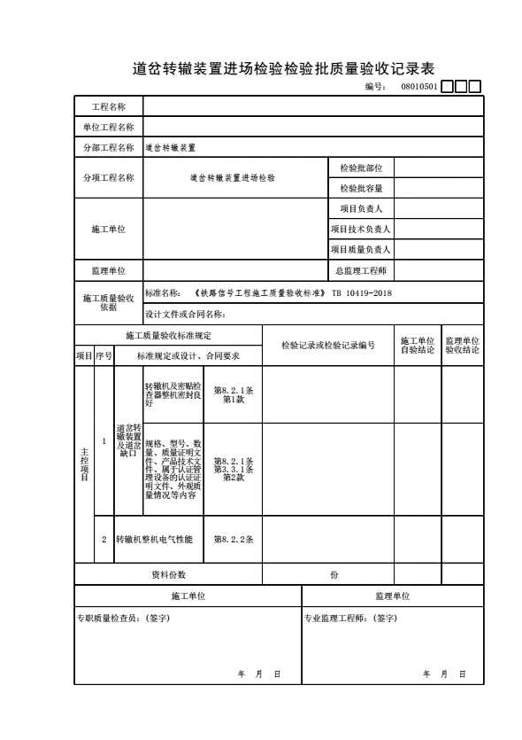 表格名称:08010501 道岔转辙装置进场检验检验批质量验收记录表