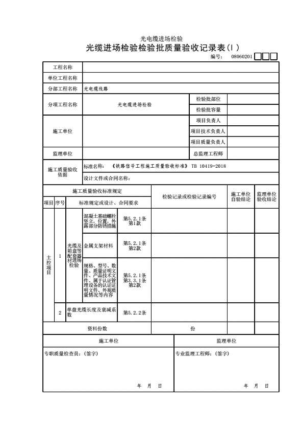 表格名称:08060201 【光电缆进场检验】光缆进场检验检验批质量验收记录表(Ⅰ)