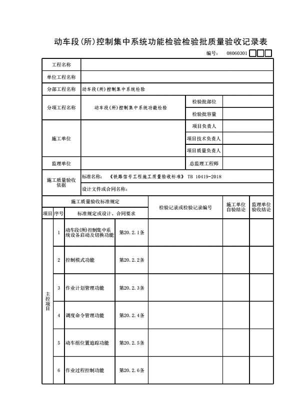 表格名称:08060301 动车段(所)控制集中系统功能检验检验批质量验收记录表