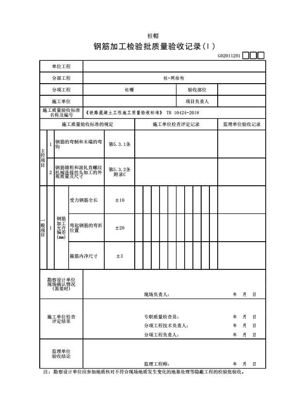 表格名称:G02011201 【桩帽】钢筋加工检验批质量验收记录(Ⅰ)
