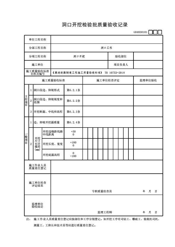 表格名称:G04030101 洞口开挖检验批质量验收记录