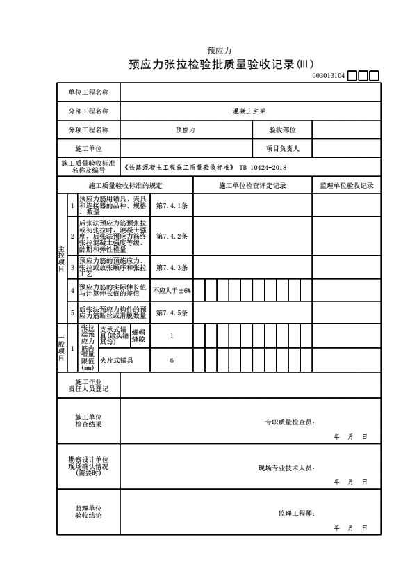 表格名称:G03013104 【预应力】预应力张拉检验批质量验收记录(Ⅲ)