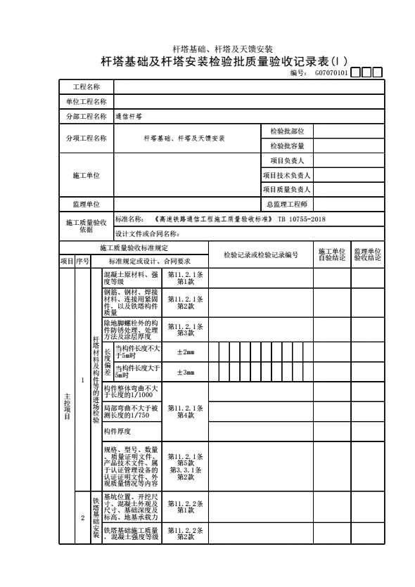 G07070101 【杆塔基础、杆塔及天馈安装】杆塔基础及杆塔安装检验批质量验收记录表(Ⅰ)