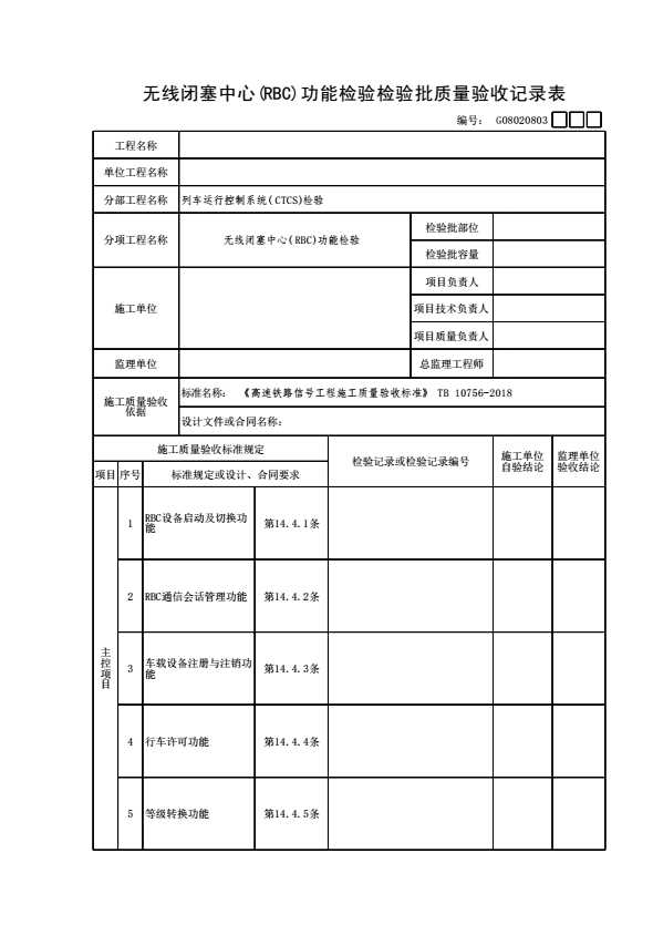 G08020803 无线闭塞中心(RBC)功能检验检验批质量验收记录表