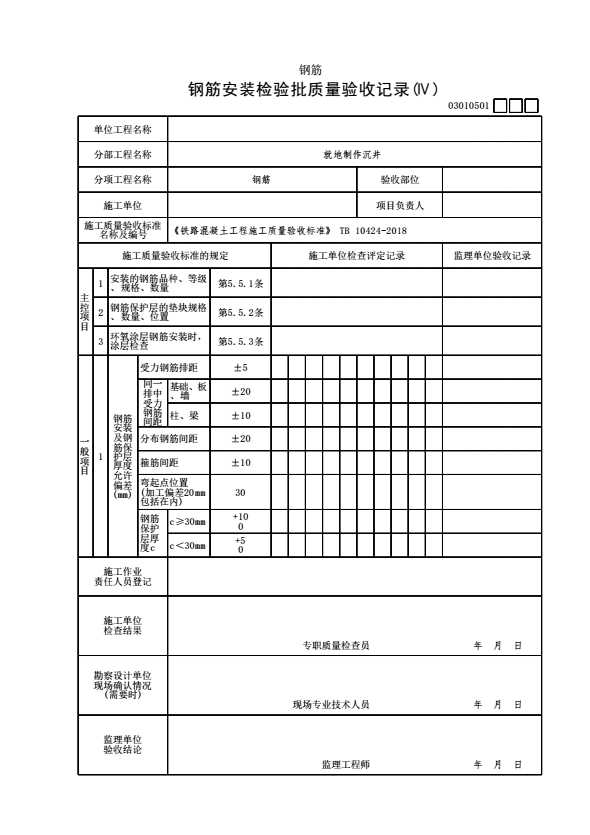 表格名称:03010501 钢筋安装检验批质量验收记录(Ⅳ)