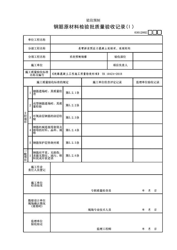 表格名称:03012002 钢筋原材料检验批质量验收记录(Ⅰ)