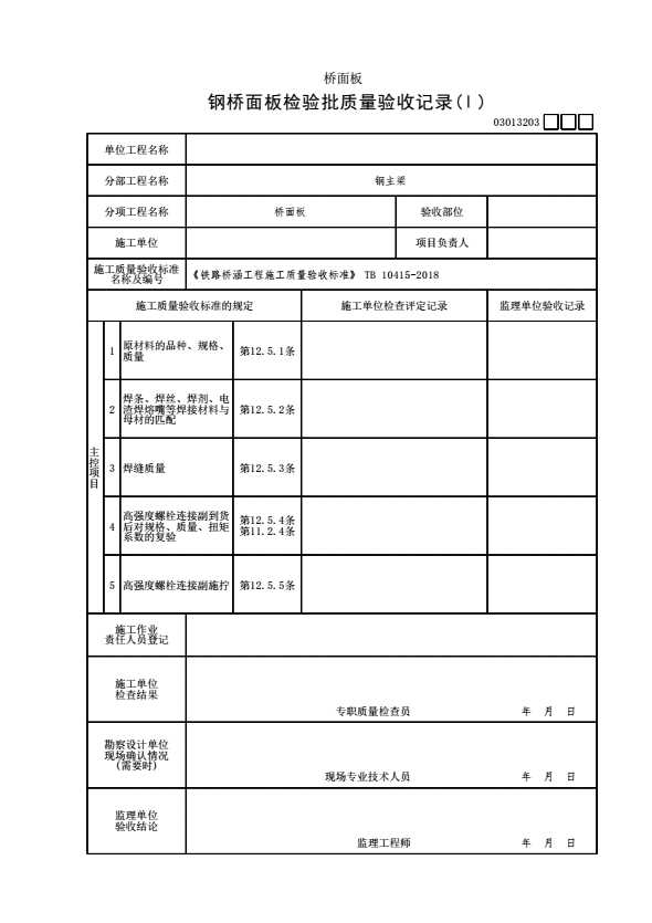 表格名称:03013203 钢桥面板检验批质量验收记录(Ⅰ)