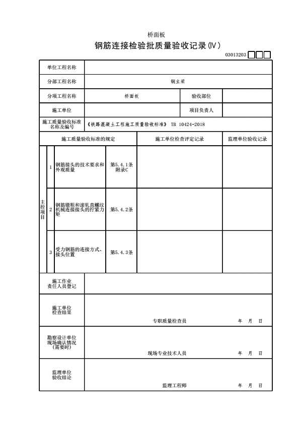 表格名称:03013203 钢筋连接检验批质量验收记录(Ⅳ)