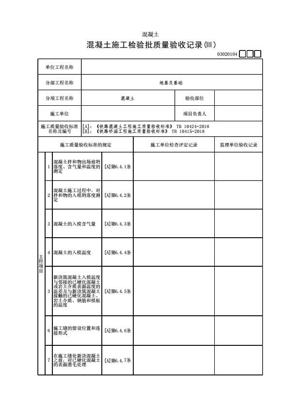表格名称:03020104 混凝土施工检验批质量验收记录(Ⅲ)